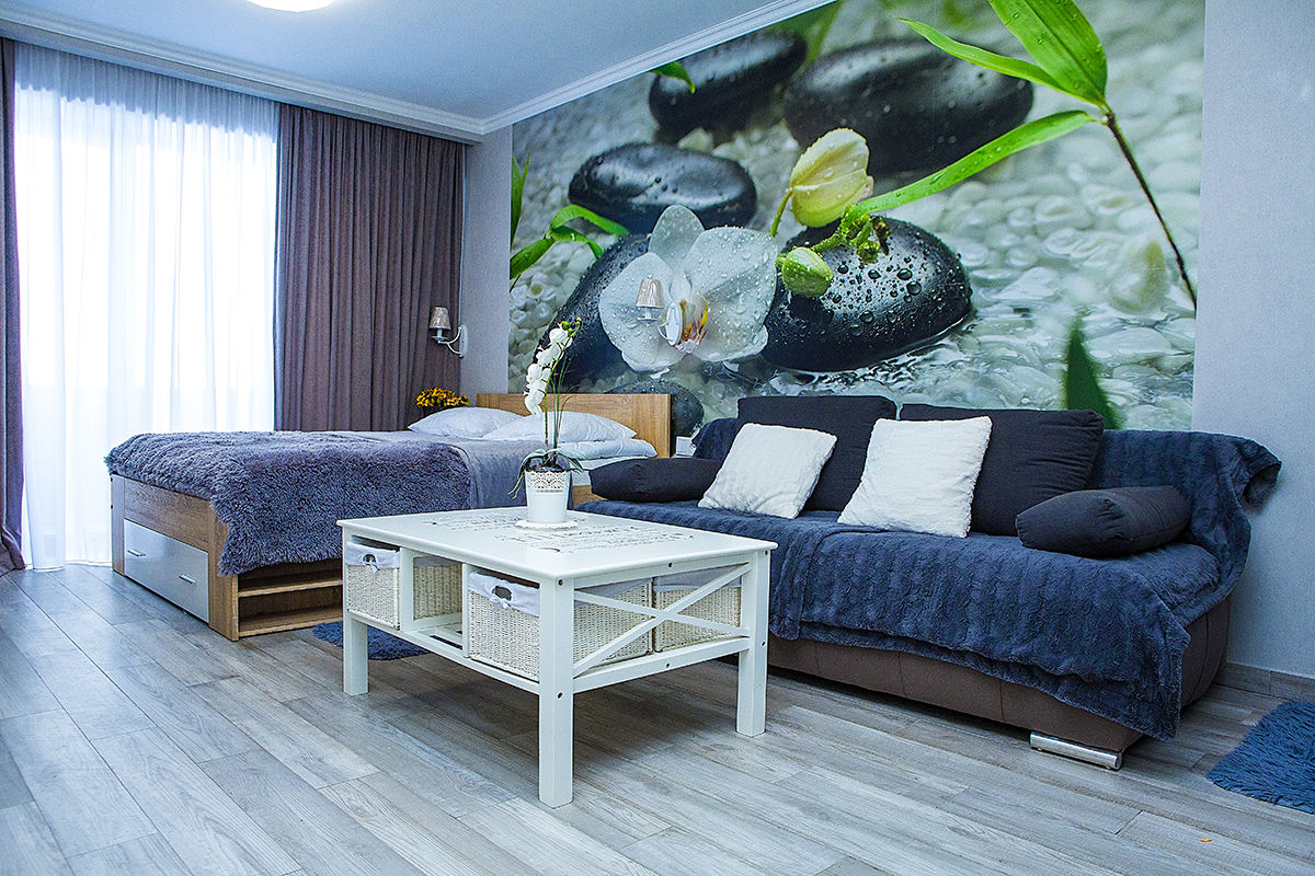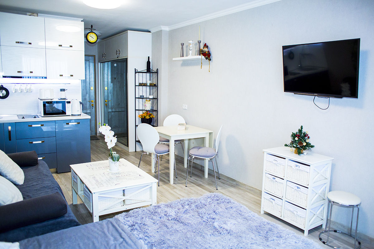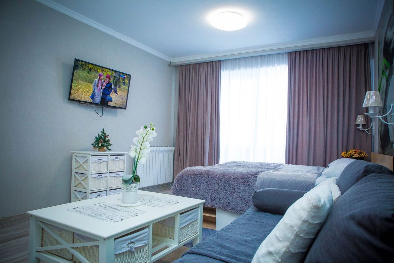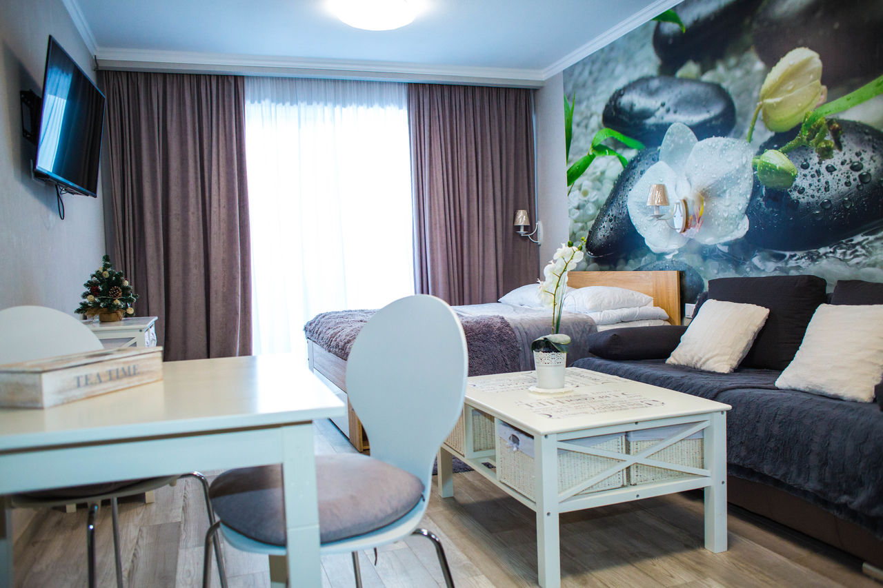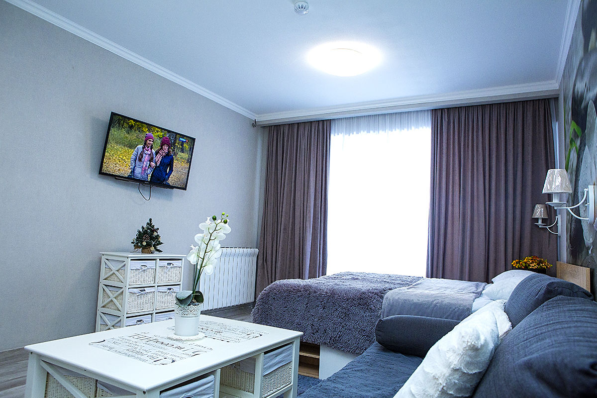 Оснащение: Апартаменты с видом на горы и балконом оснащены новой техникой, Smart телевизор с плоским экраном, Wi-Fi, холодильник, микровалновая печь, тостер, кофеварка, стиральная машина , детская кроватка- манеж до 4 лет ( за дополнительную цену- 50 лари). Двухспальная кровать(160-200).Раскладной диван(160-200) предоставляются полотенца, белье, тапочки, фен.