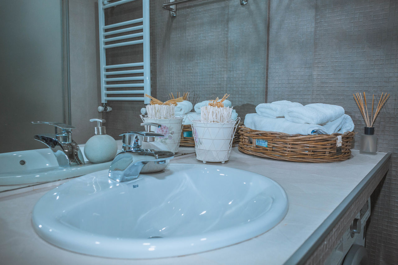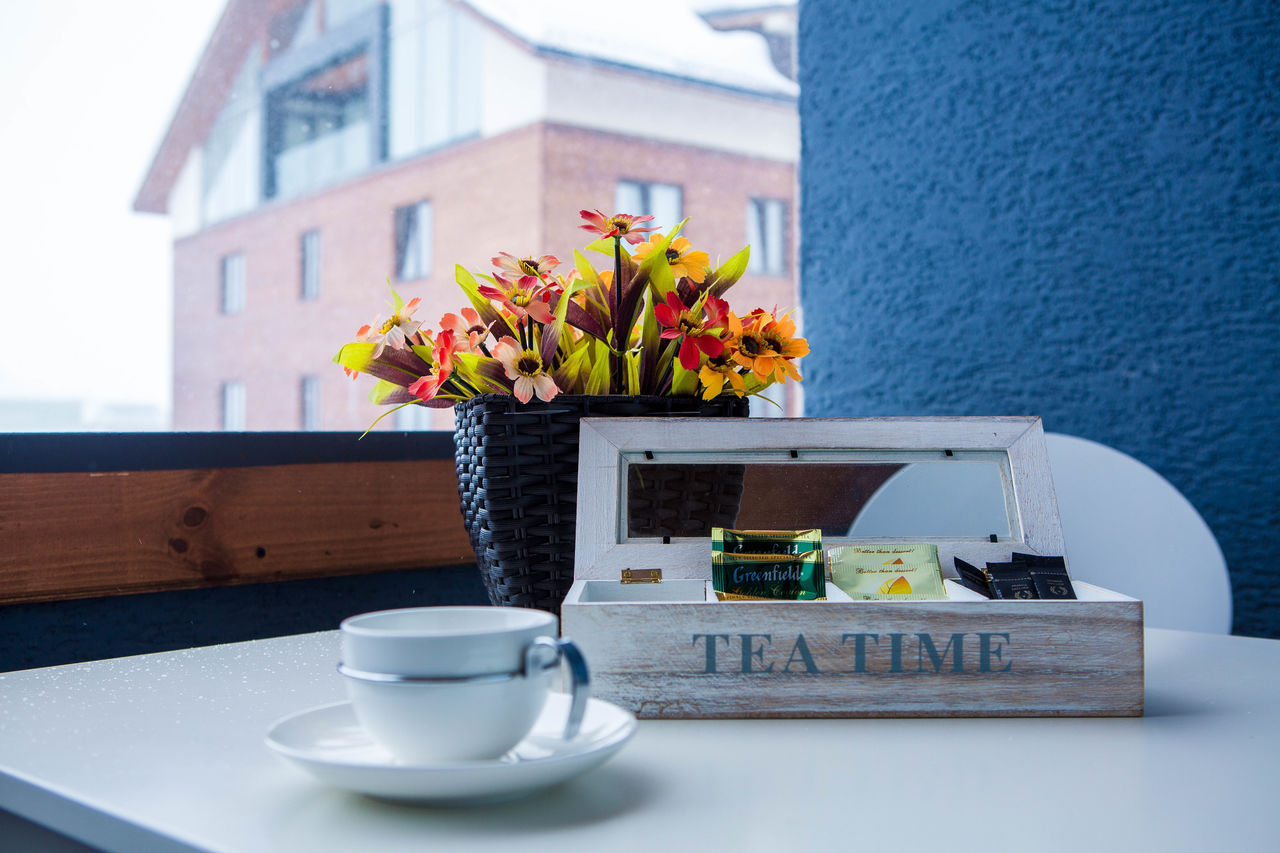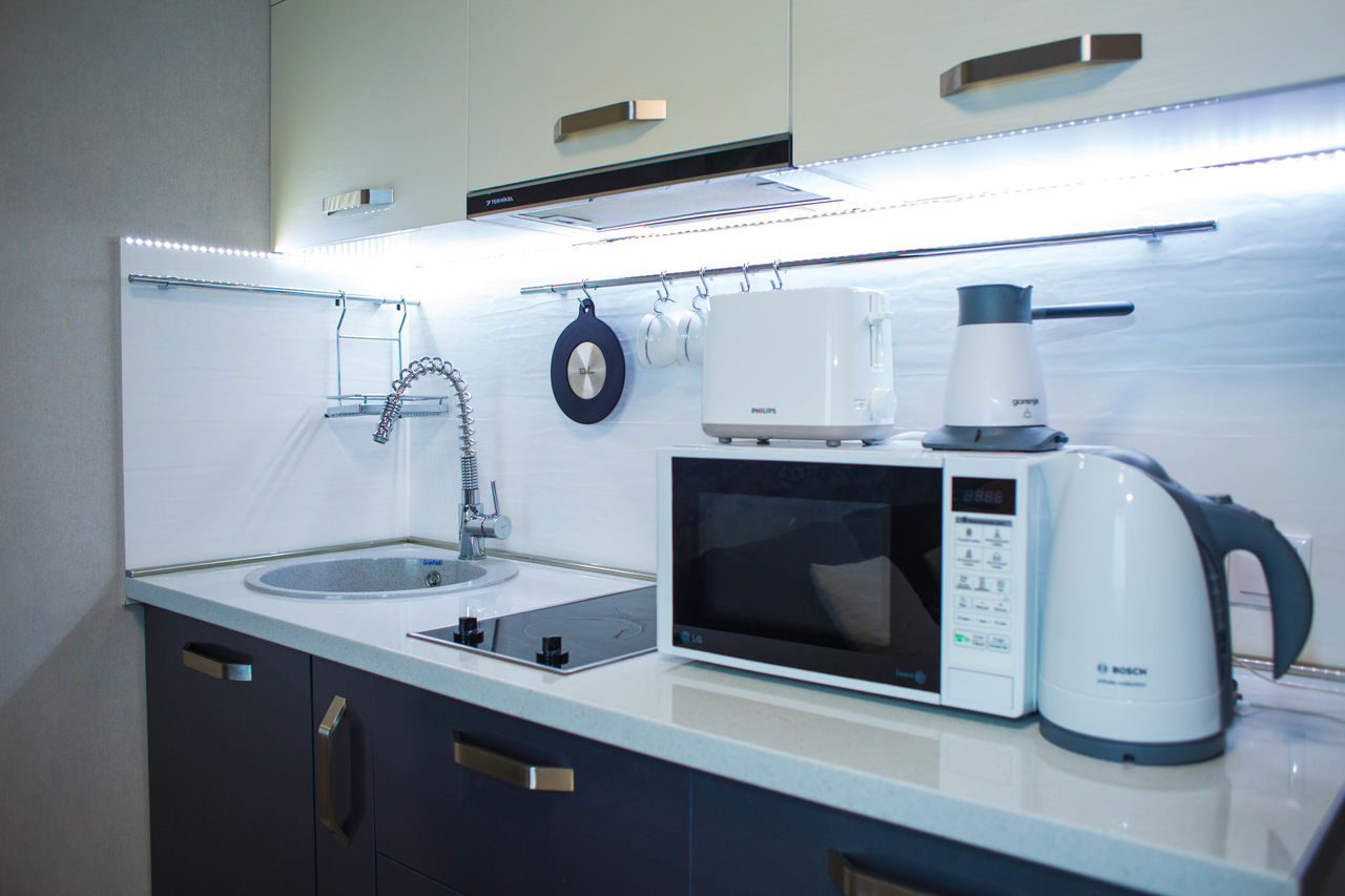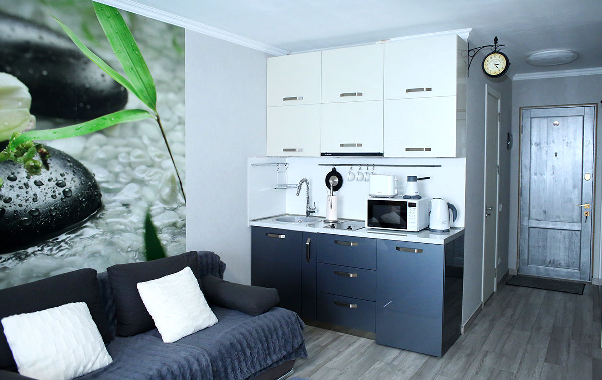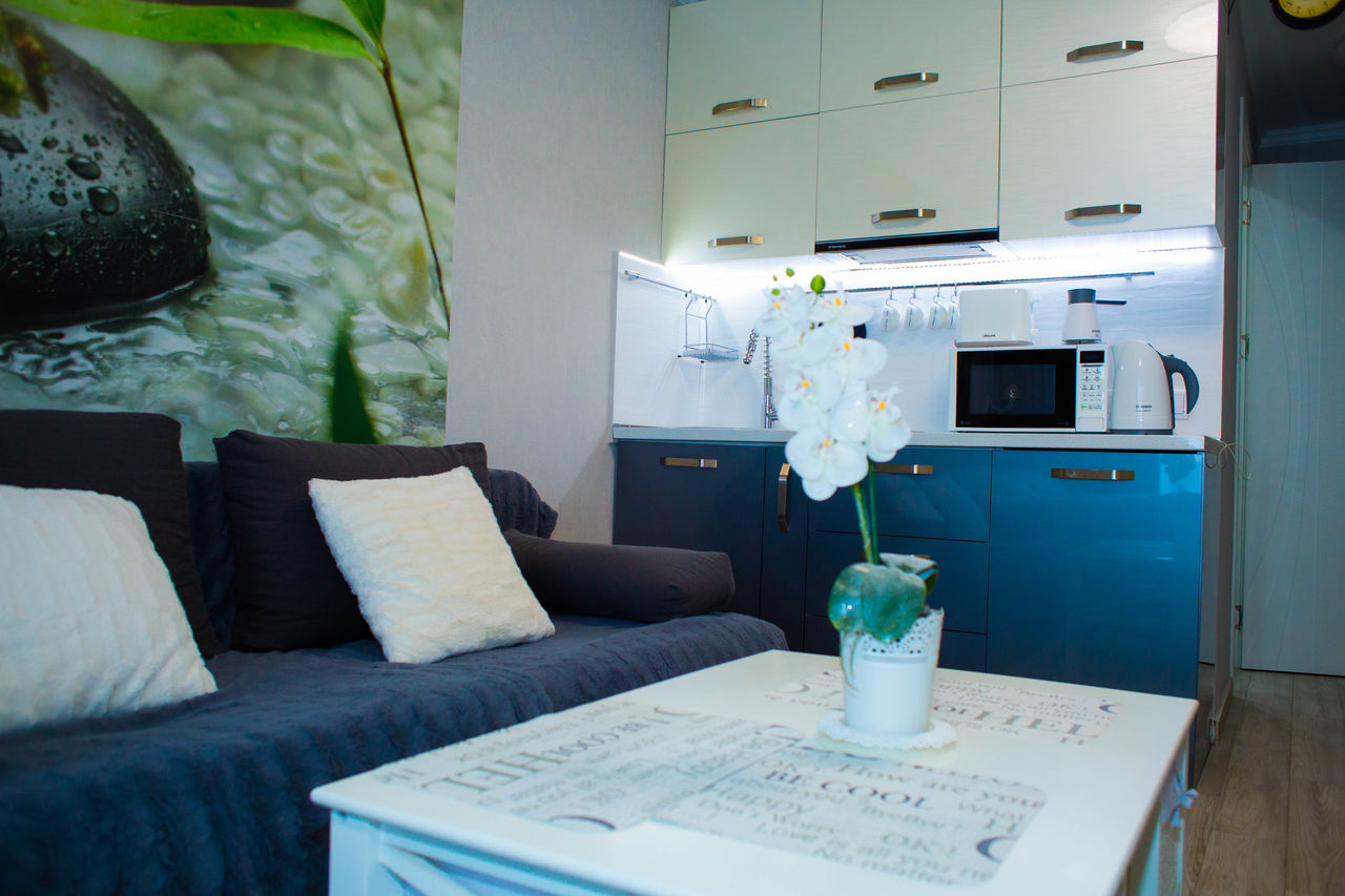 Оснащение: Апартаменты с видом на горы и балконом оснащены новой техникой, Smart телевизор с плоским экраном, Wi-Fi, холодильник, микровалновая печь, тостер, кофеварка, стиральная машина , детская кроватка- манеж до 4 лет ( за дополнительную цену- 50 лари). Двухспальная кровать(160-200).Раскладной диван(160-200) предоставляются полотенца, белье, тапочки, фен.