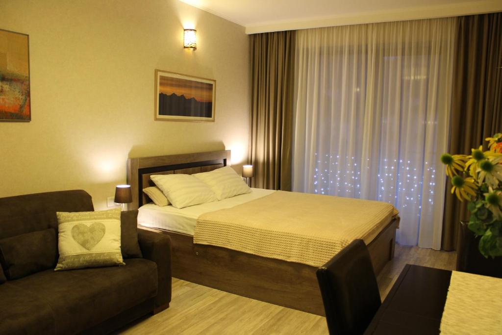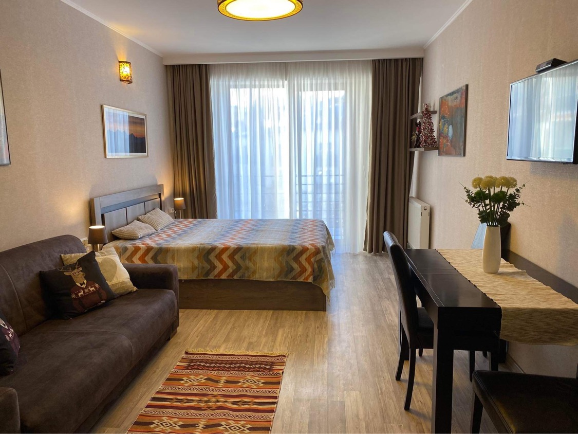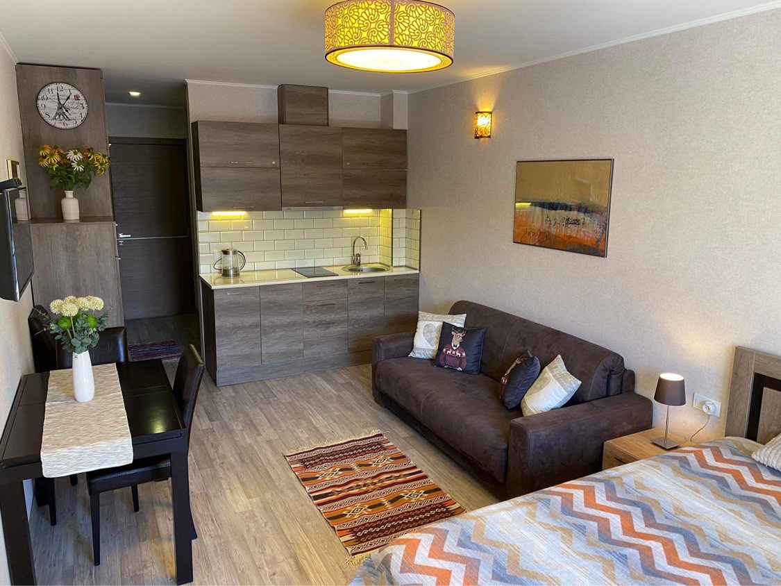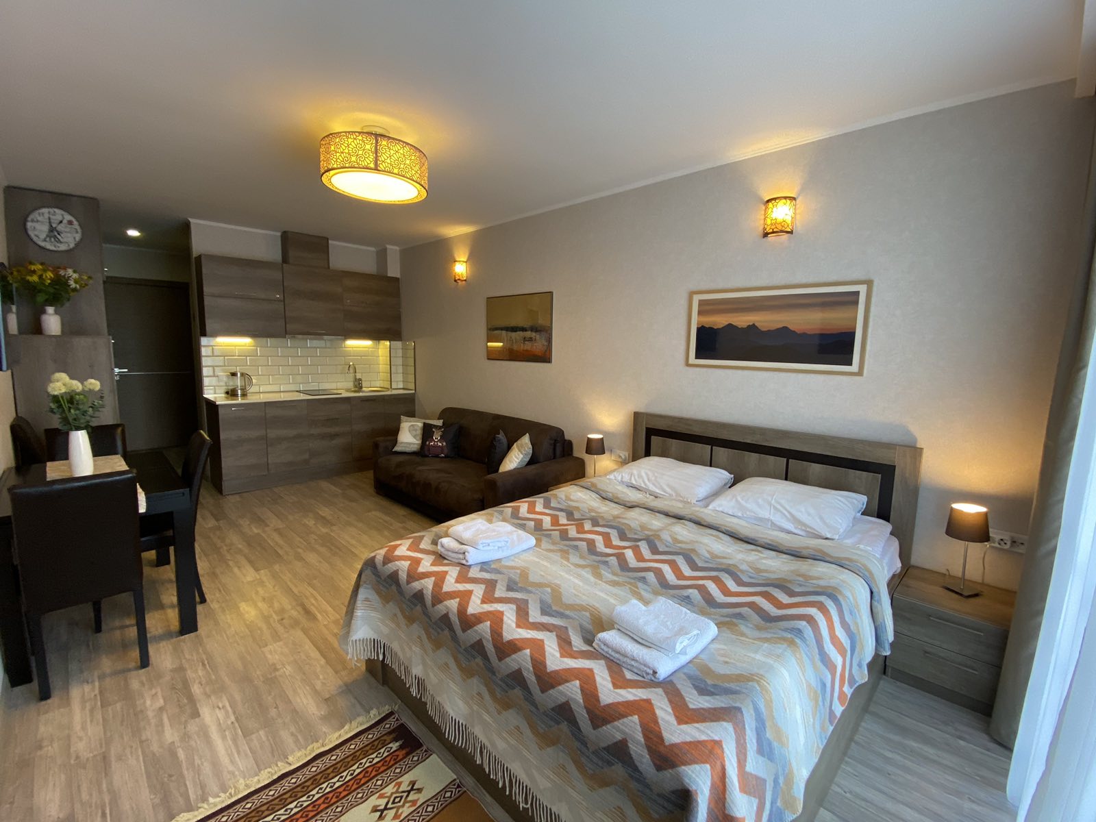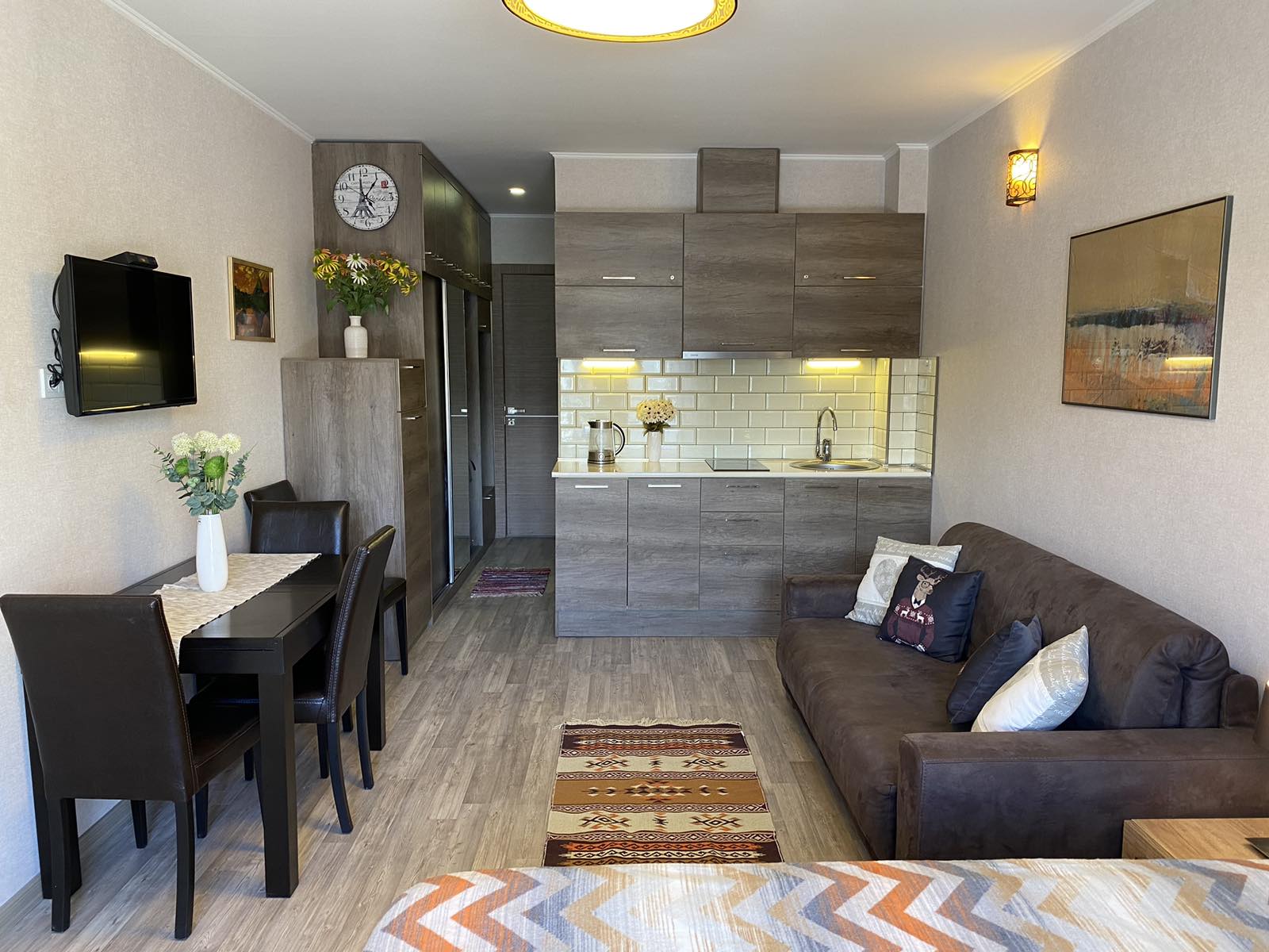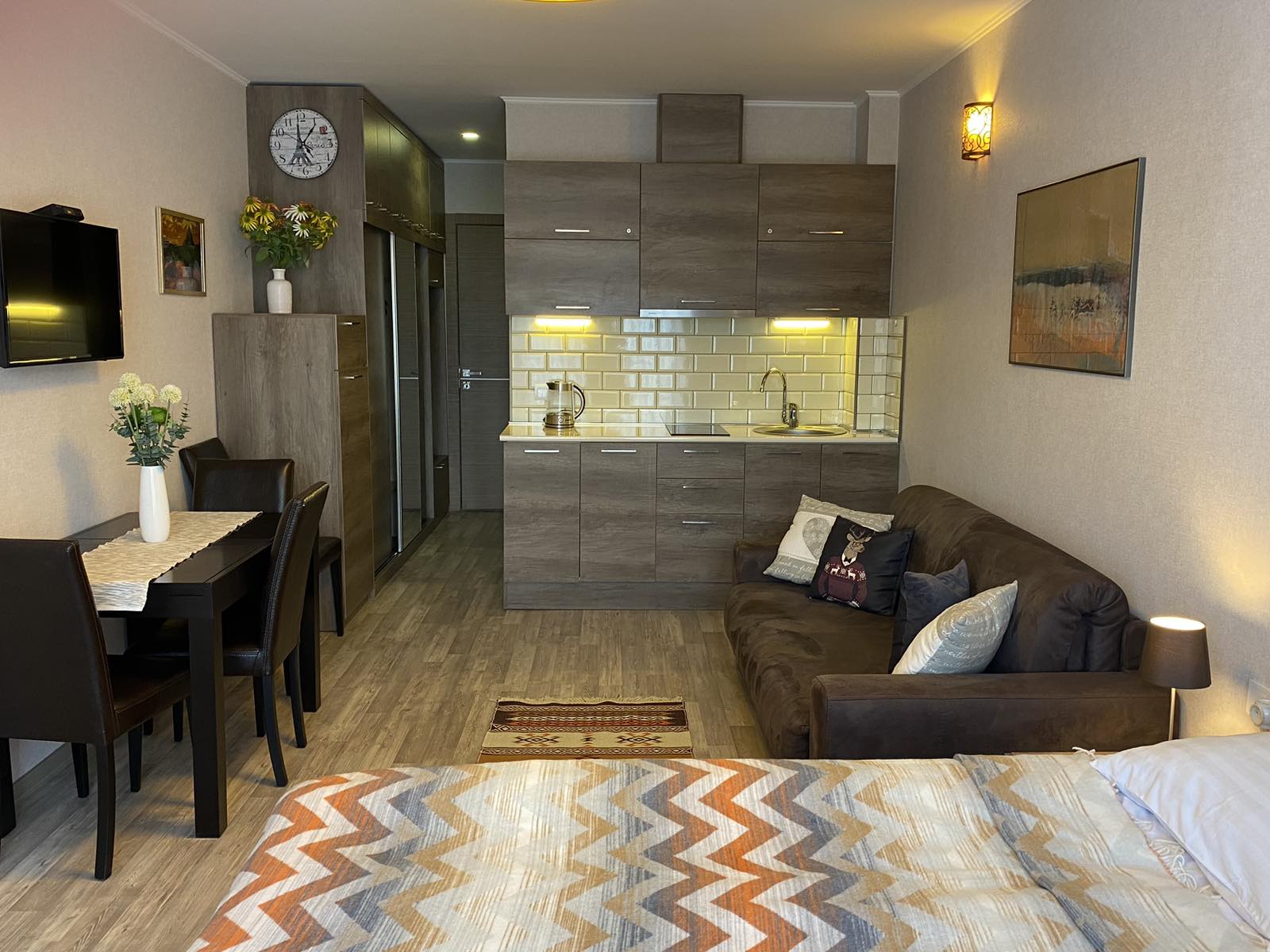 Оснащение: 1 комнатная, комфортабельная полностью мебeлированная квартира (площадь 30 кв.м), с балконам с которого открывается прекрасный вид на горы и на внутренный двор. Квартира рассчитана на 4 человека, двухспальная кровать (160х200) и раскладной диван. (160х200). Ванная комната в апартаментах оборудована душ-кабиной, имеется фен, LCD телевизор, полностью оборудованная кухня (посуда, эл.чайник, холодильник, плита, микроволновая печь), интернет - Wi-Fi. Постельные принадлежности и полотенца включены в стоимость.