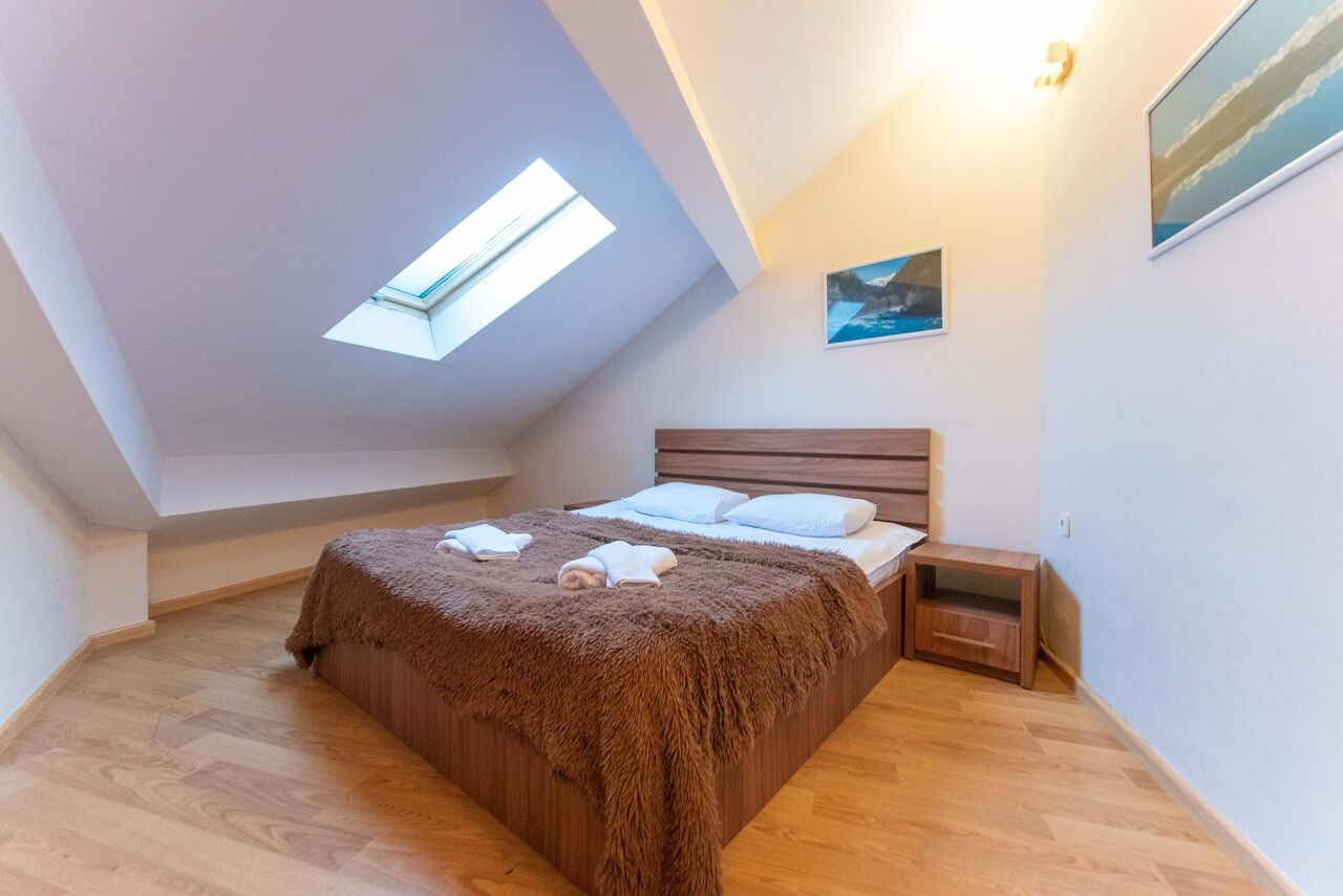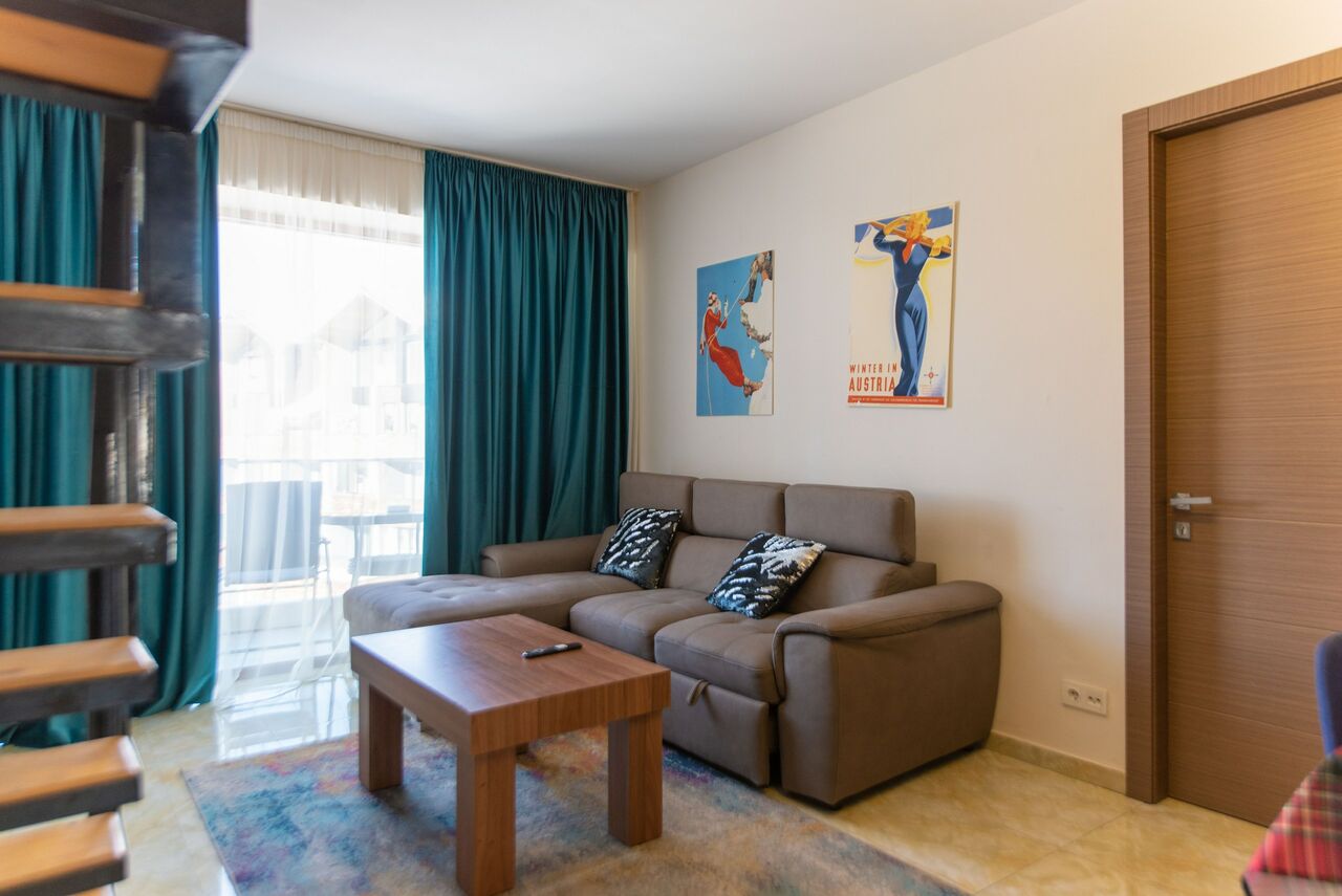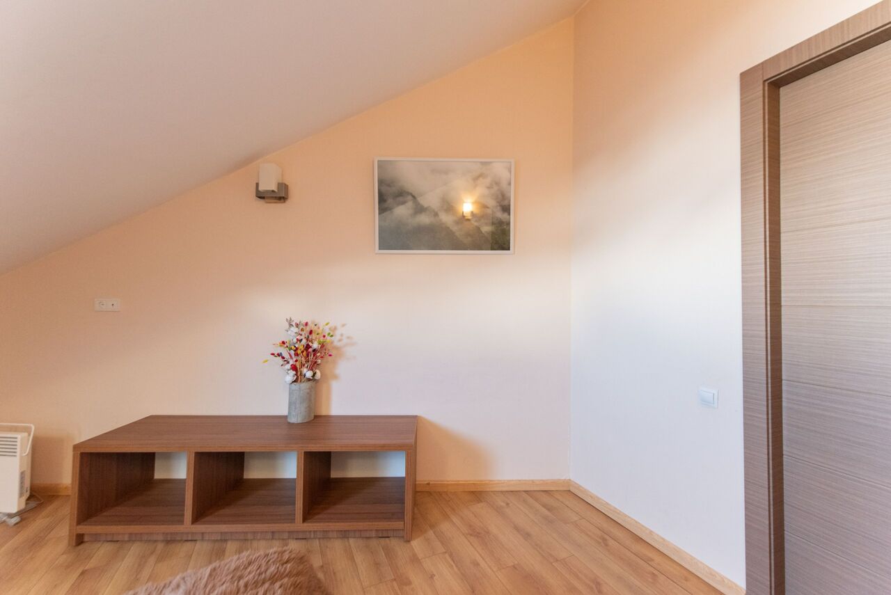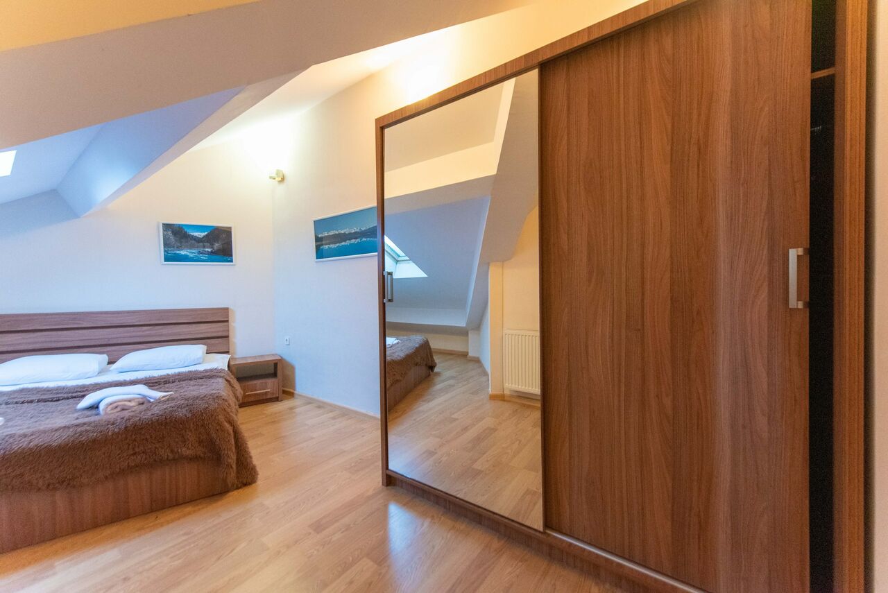 В апартаментах 3 отдельных спальни с видом на горы, в каждой из которых прекрасная двуспальная кровать, и кухня-гостиная с диваном, который лёгким движением руки превращается в двуспальный. Апартаменты располагают большим количеством встроенных шкафов, которые вместят не только носки и футболки, но и сноубордическую/горнолыжную одежду всей компании, а для хранения оборудования Вы можете свободно пользоваться ски-депо апартаментов. Всё это позволяет сохранить достаточно свободного пространства для каждого члена даже большой компании, так что размещение в этих апартаментах для 6-8 человек будет весьма комфортным. Для удобства гостей оборудовано 2 сан узла: один с ванной, другой - с душем. В кухне имеется вся необходимая утварь как для приготовления (варочная панель, холодильник, чайник, кофеварка, сковороды, кастрлюли и тп), так и для сервировки стола на 8 человек (бокалы для вина, для шампанского, стаканы для воды, тарелки, чашки, блюдца и тп). Постель и полотенца наиприятнейшие.