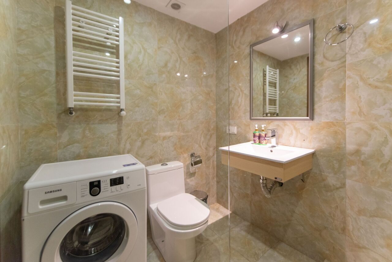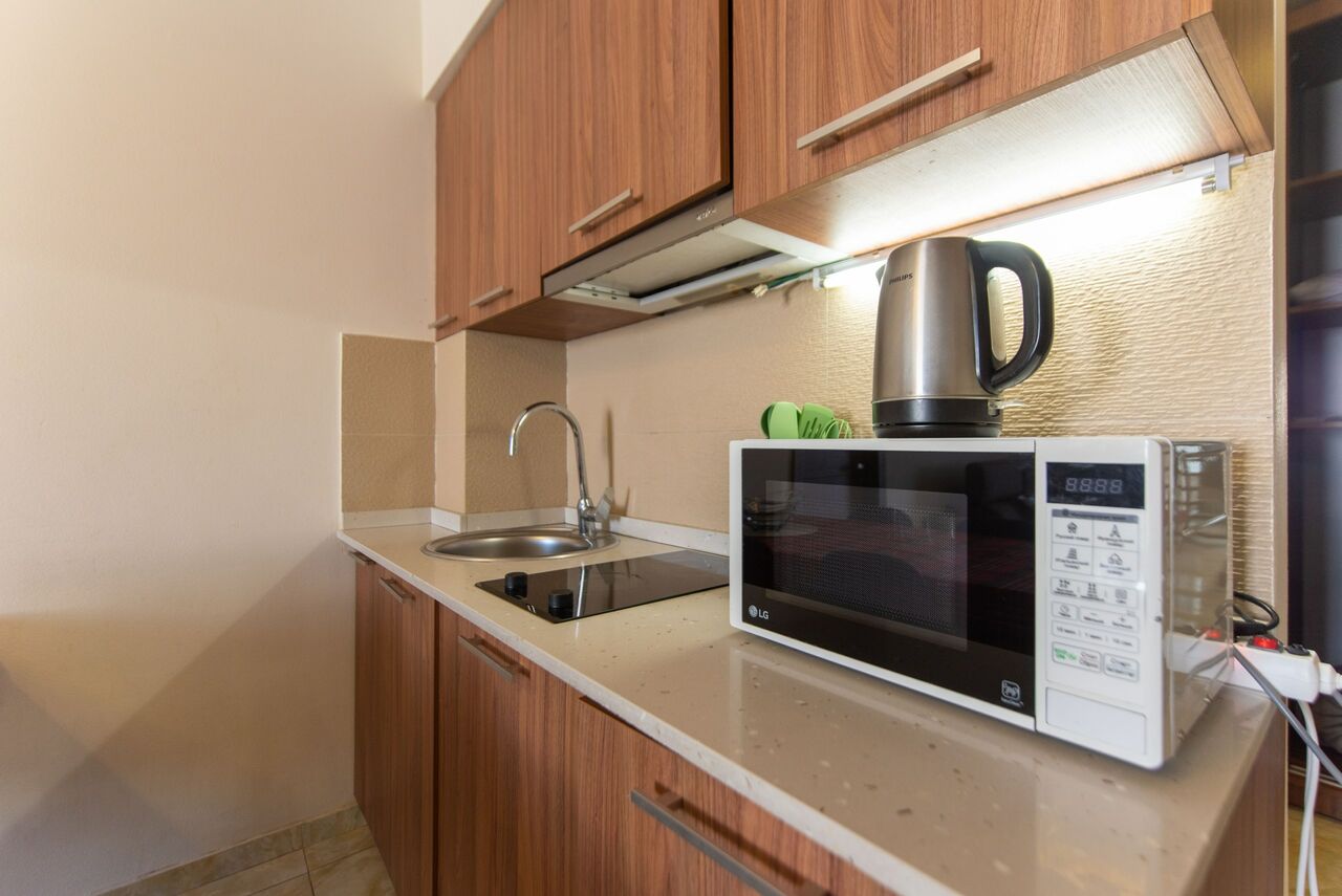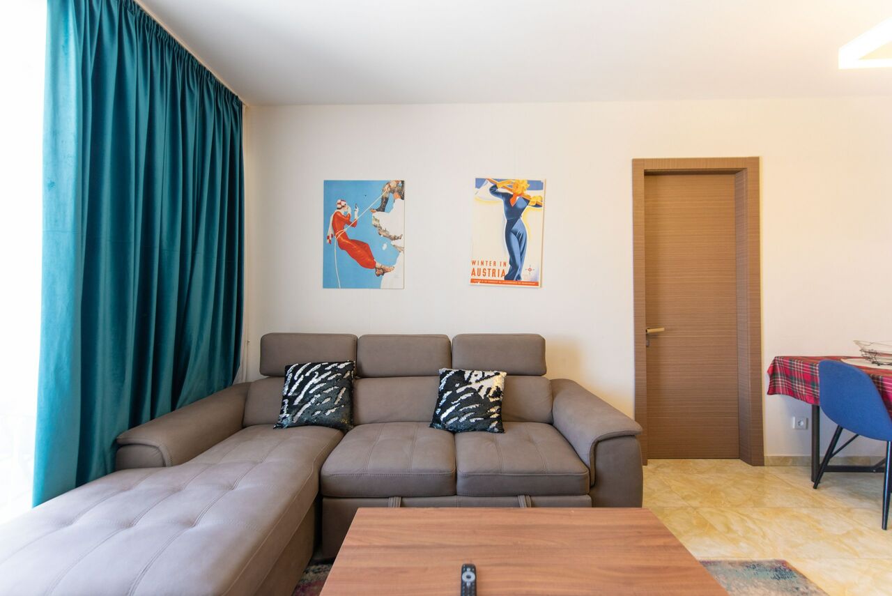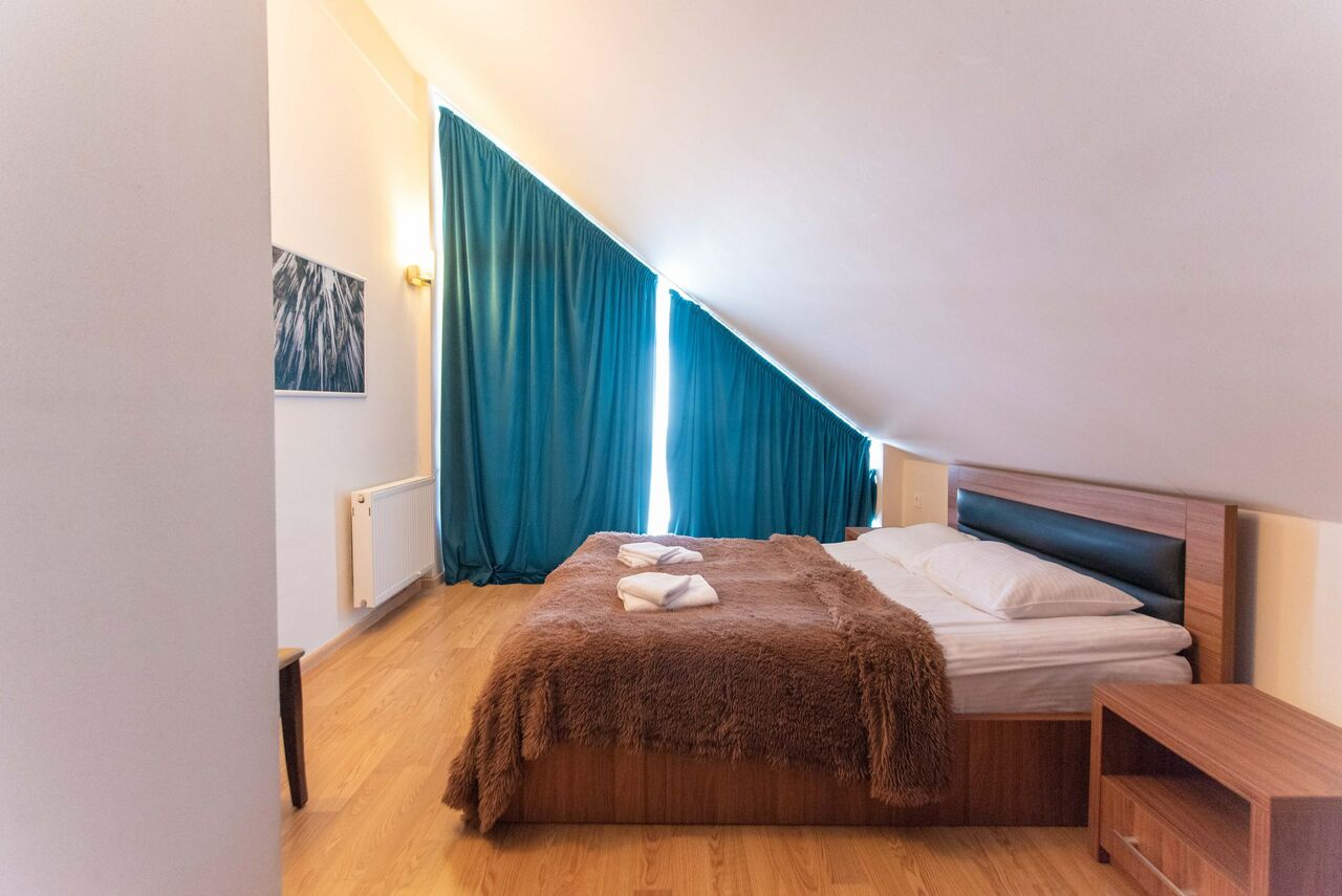 В апартаментах 3 отдельных спальни с видом на горы, в каждой из которых прекрасная двуспальная кровать, и кухня-гостиная с диваном, который лёгким движением руки превращается в двуспальный. Апартаменты располагают большим количеством встроенных шкафов, которые вместят не только носки и футболки, но и сноубордическую/горнолыжную одежду всей компании, а для хранения оборудования Вы можете свободно пользоваться ски-депо апартаментов. Всё это позволяет сохранить достаточно свободного пространства для каждого члена даже большой компании, так что размещение в этих апартаментах для 6-8 человек будет весьма комфортным. Для удобства гостей оборудовано 2 сан узла: один с ванной, другой - с душем. В кухне имеется вся необходимая утварь как для приготовления (варочная панель, холодильник, чайник, кофеварка, сковороды, кастрлюли и тп), так и для сервировки стола на 8 человек (бокалы для вина, для шампанского, стаканы для воды, тарелки, чашки, блюдца и тп). Постель и полотенца наиприятнейшие.