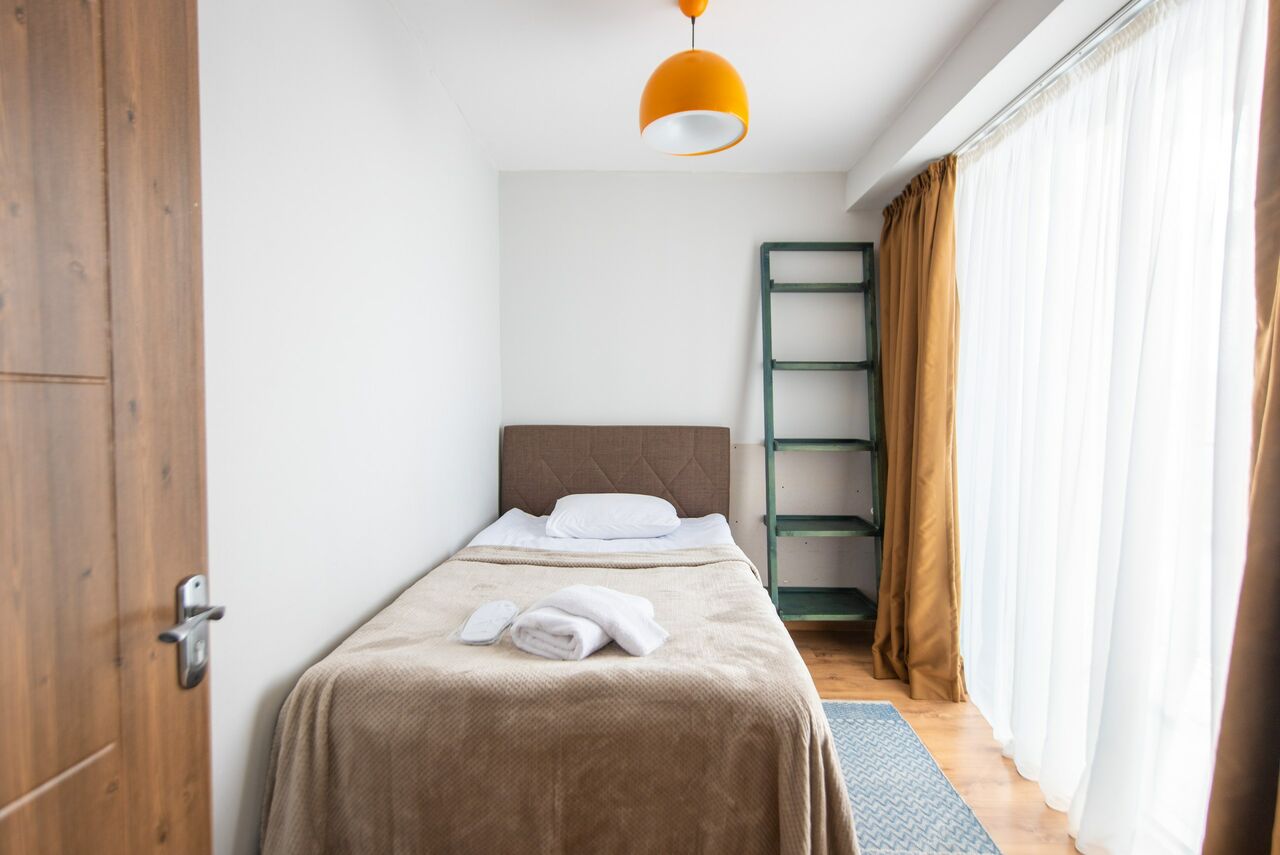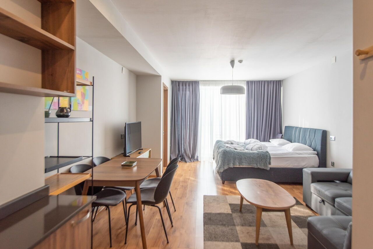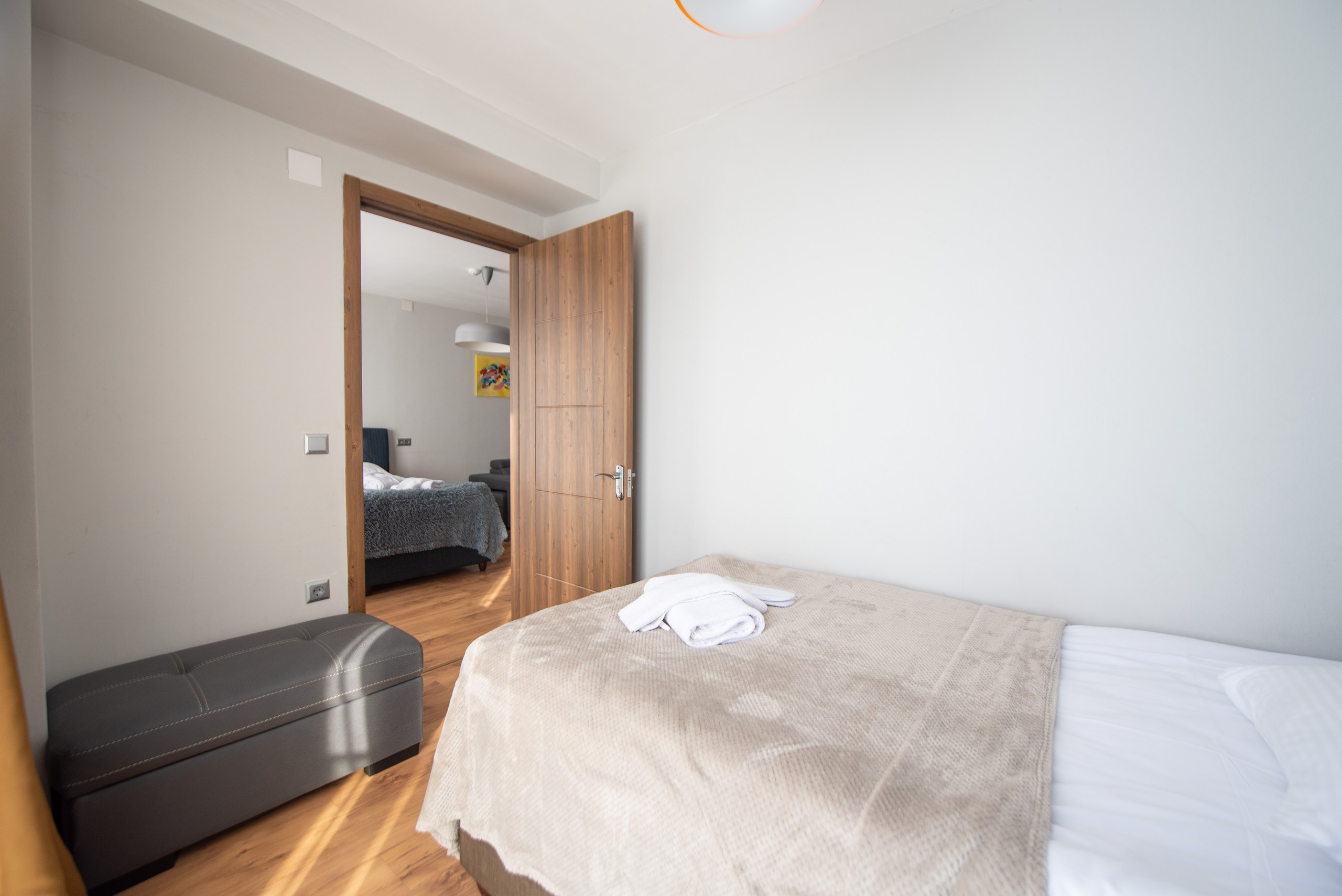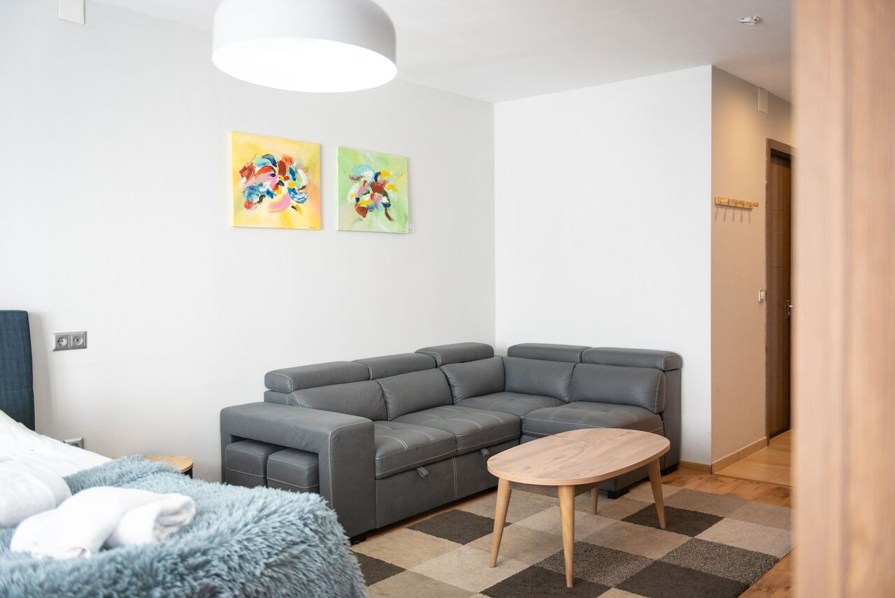 квартира рассчитана на 5 человек, есть одна двуспальная кровать, 1 односпальная кровать, один диван-кровать на 2 человека, телевизор, бесплатный Wi-Fi, также нашим гостям предоставляется скидка 20 % в спа-центре и 10 % скидка в ресторане «Шале»