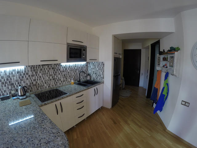 Кухня оснащена всем необходимым:сервировочная посуда высокого качества на 6 персон, встроенная варочная панель, микроволновая печь, тостер, электро чайник, большой холодильник.