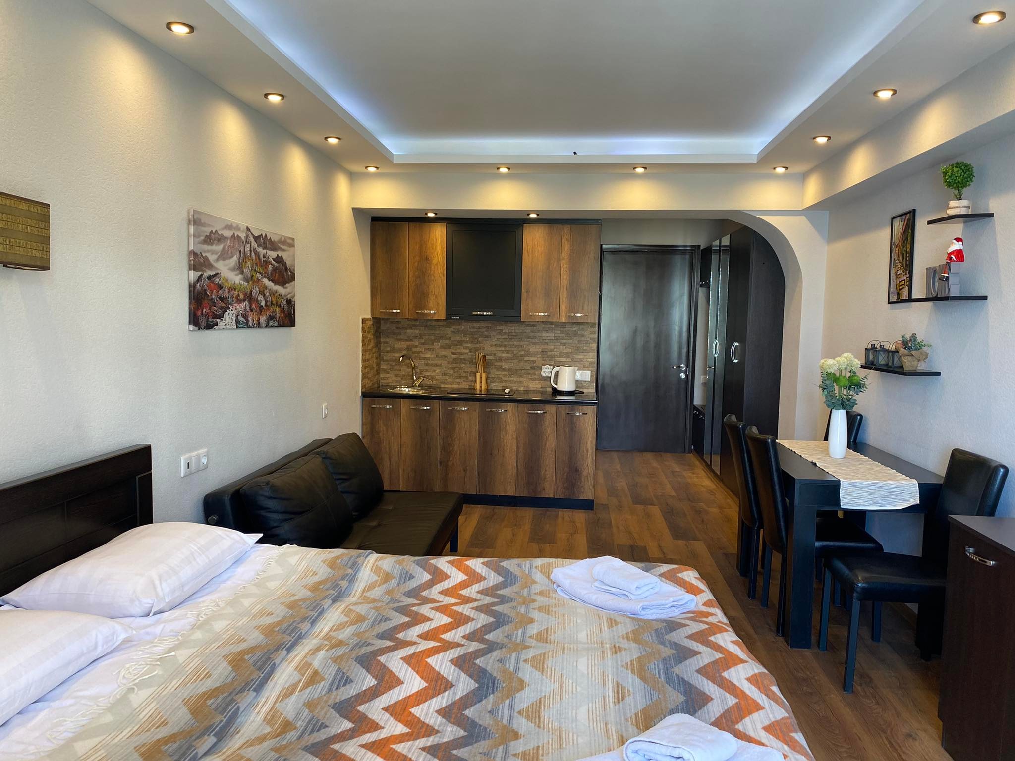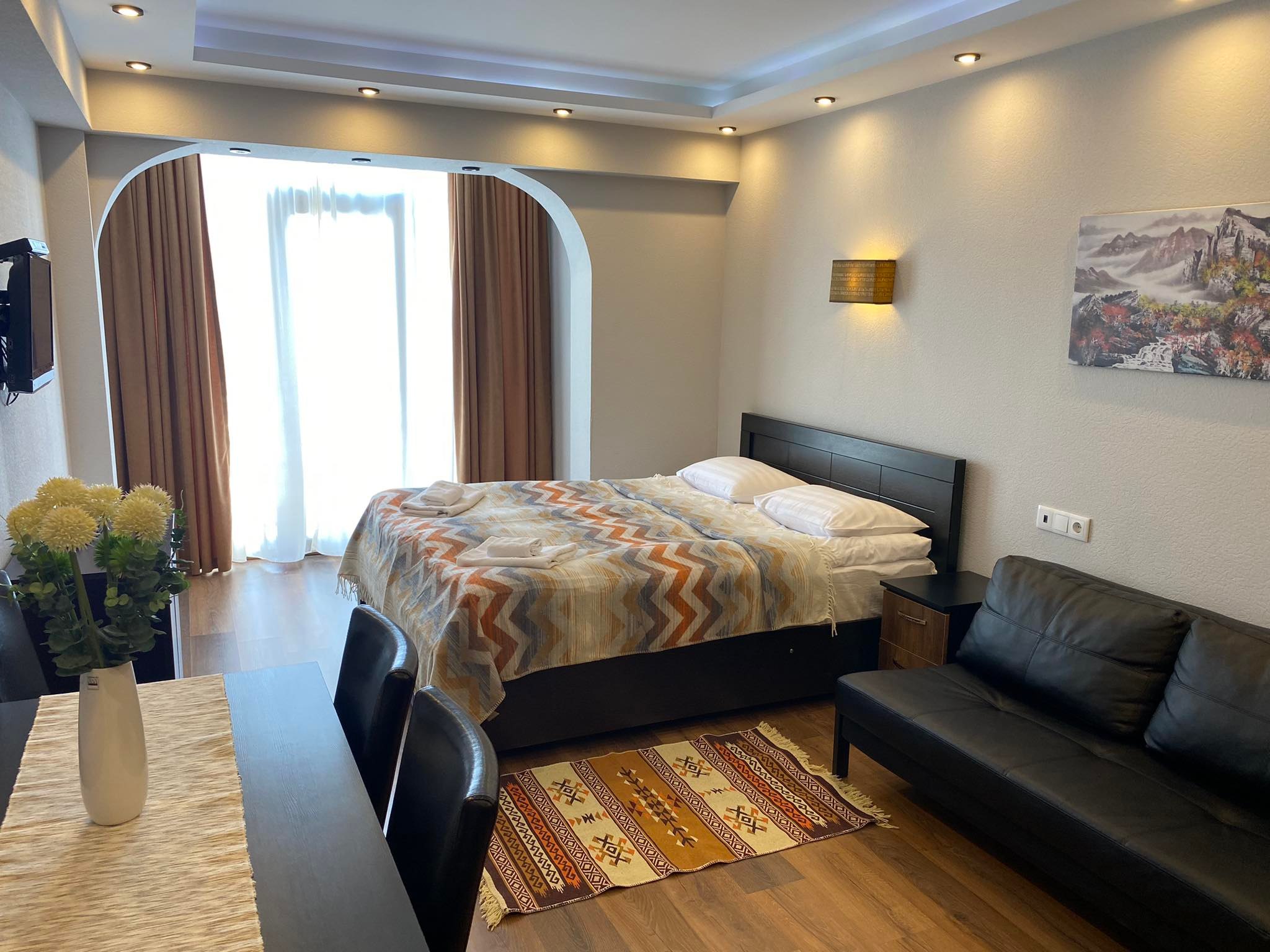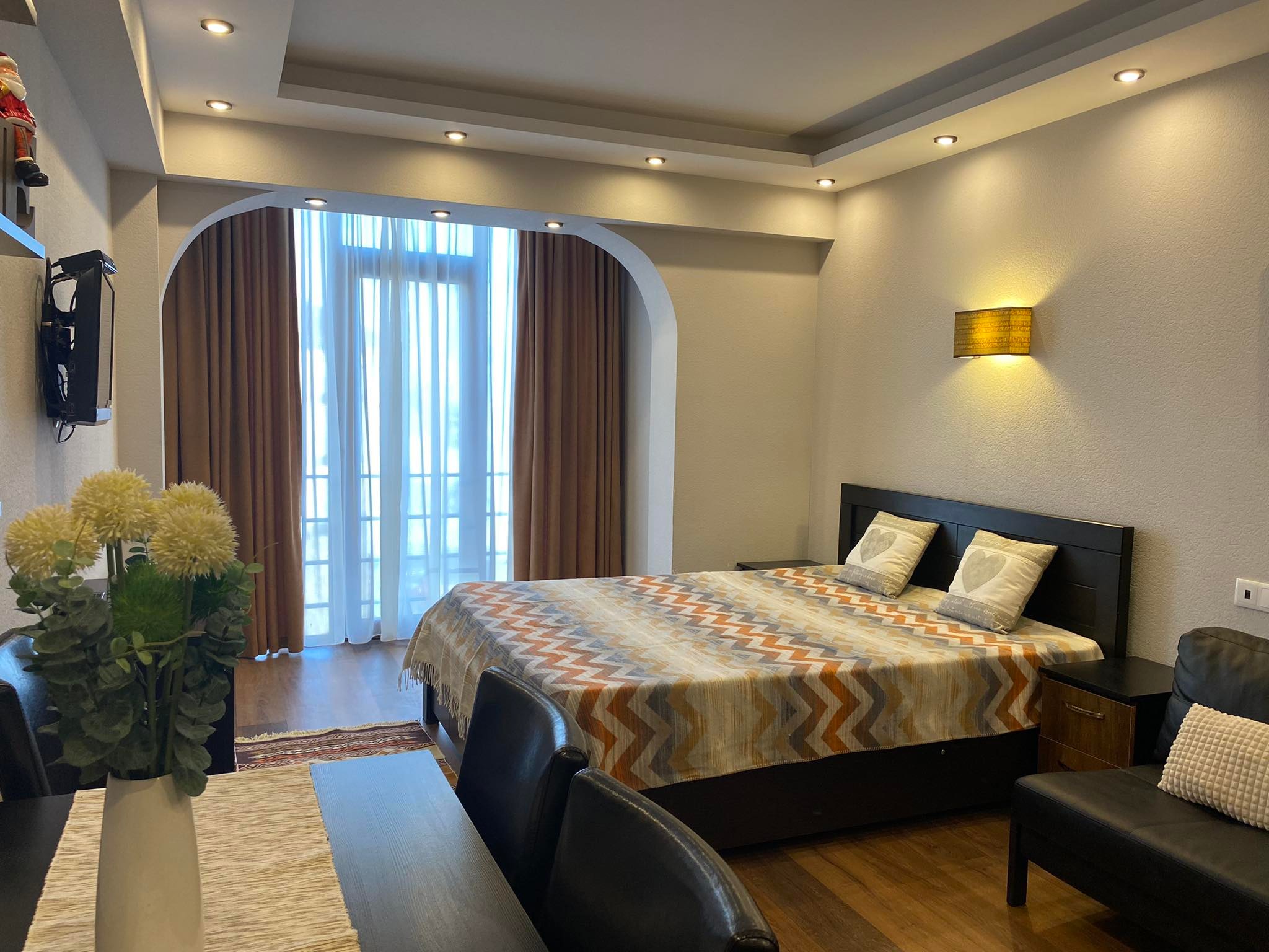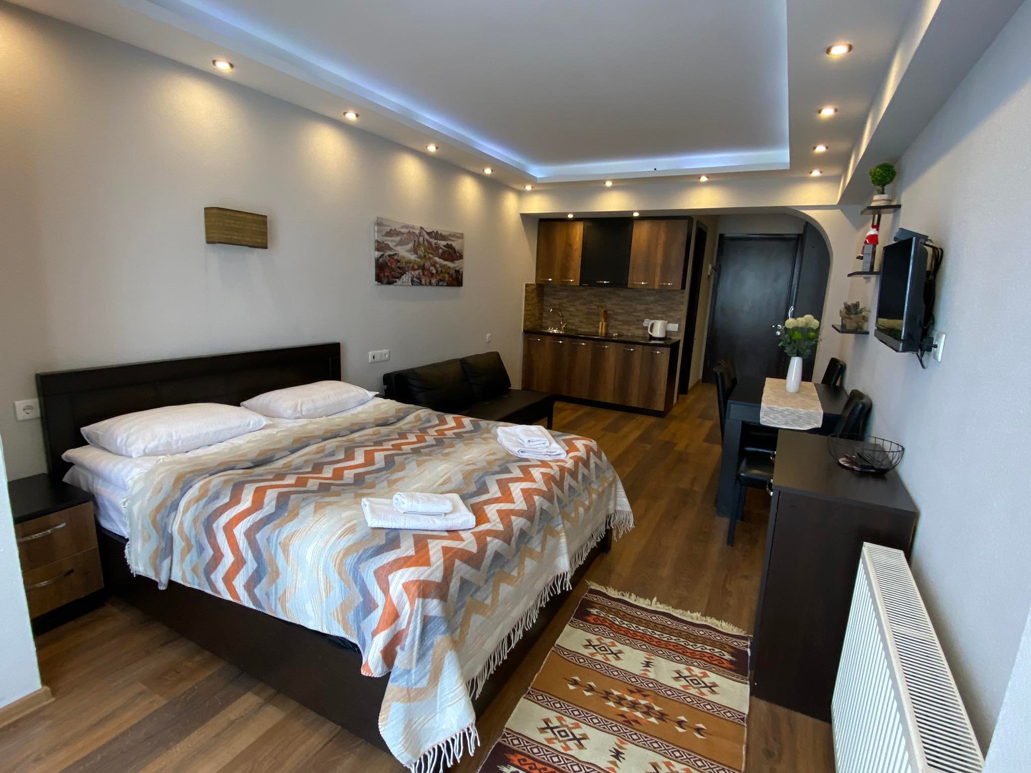 Оснащение: 1 комнатная, комфортабельная, полностью мебeлированная квартира (площадь 30 кв.м), с французским окном, с которого открывается прекрасный вид на горы. Квартира рассчитана на 4 человека, двухспальная кровать (160х200) и раскладной диван. Ванная комната в апартаментах оборудована душ-кабиной, имеется фен. LCD телевизор, полностью оборудованная кухня (посуда, эл.чайник, холодильник, плита, микроволновая печь), интернет - Wi-Fi. Постельные принадлежности и полотенца включены в стоимость.
