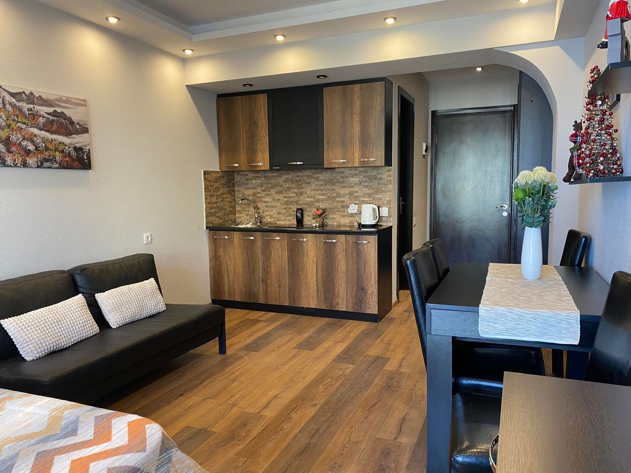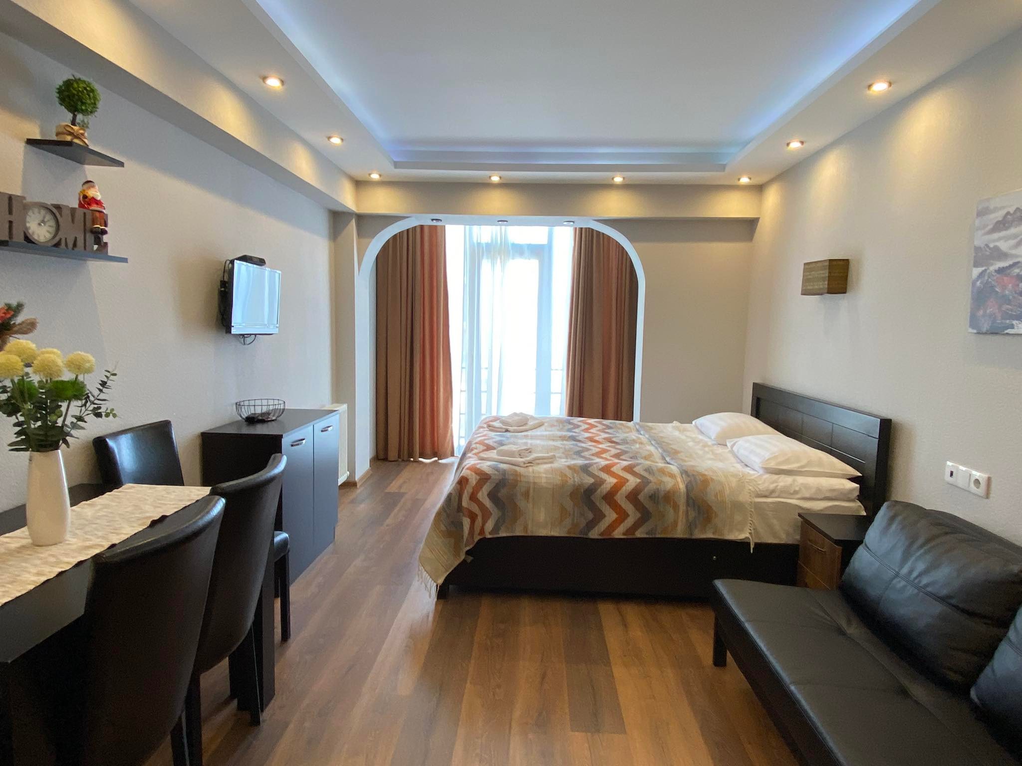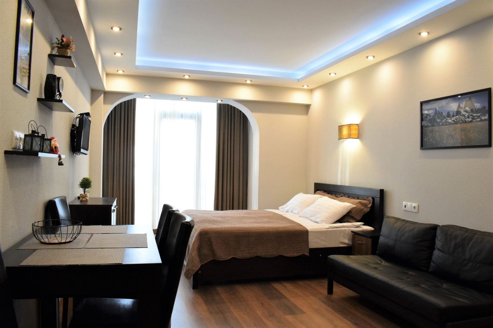 Оснащение: 1 комнатная, комфортабельная, полностью мебeлированная квартира (площадь 30 кв.м), с французским окном, с которого открывается прекрасный вид на горы. Квартира рассчитана на 4 человека, двухспальная кровать (160х200) и раскладной диван. Ванная комната в апартаментах оборудована душ-кабиной, имеется фен. LCD телевизор, полностью оборудованная кухня (посуда, эл.чайник, холодильник, плита, микроволновая печь), интернет - Wi-Fi. Постельные принадлежности и полотенца включены в стоимость.