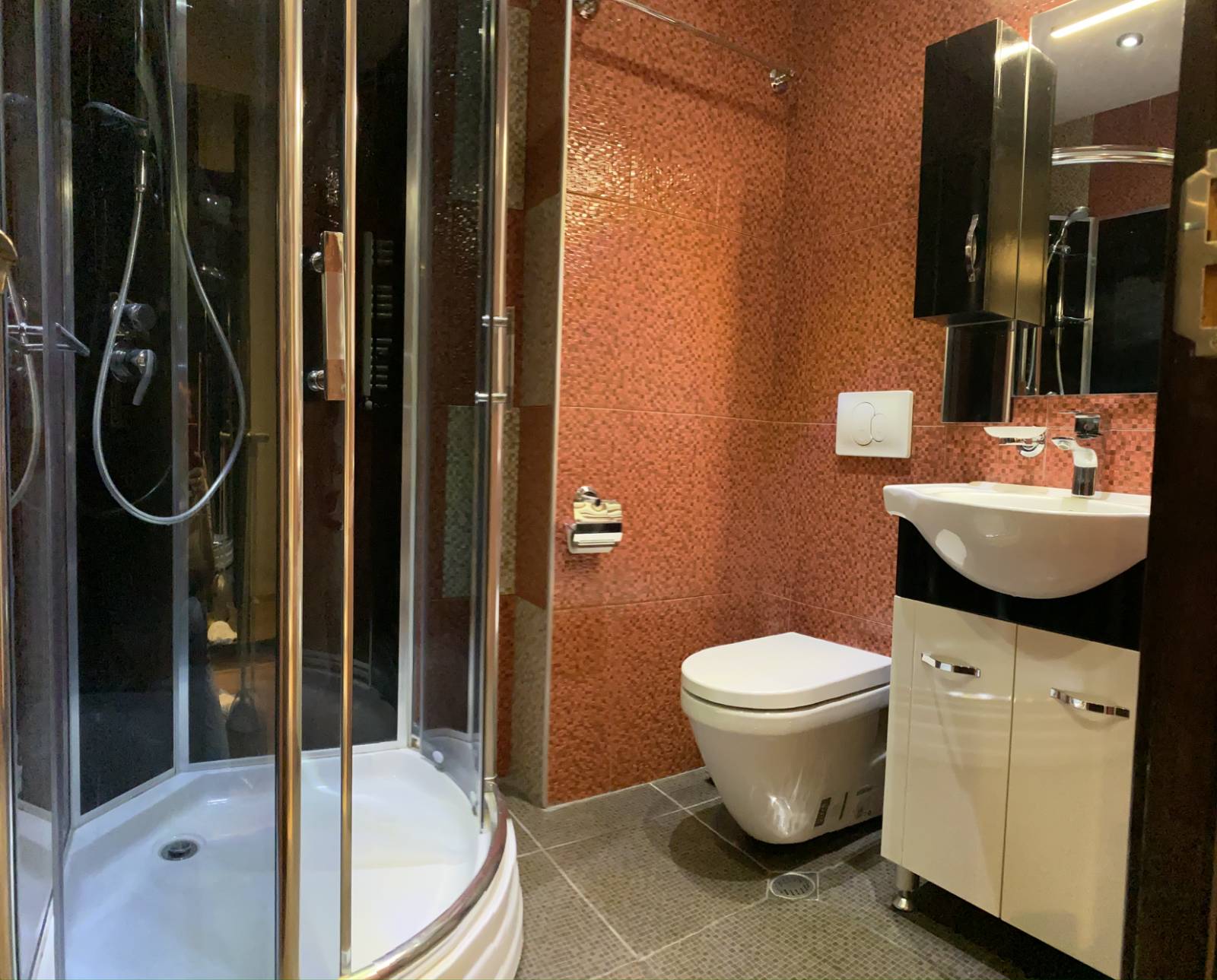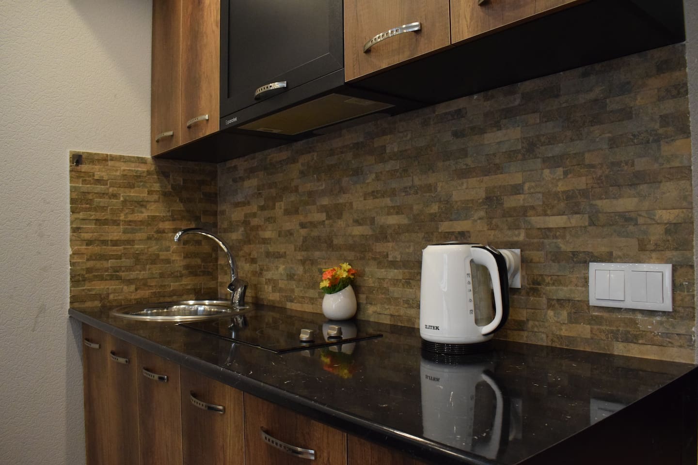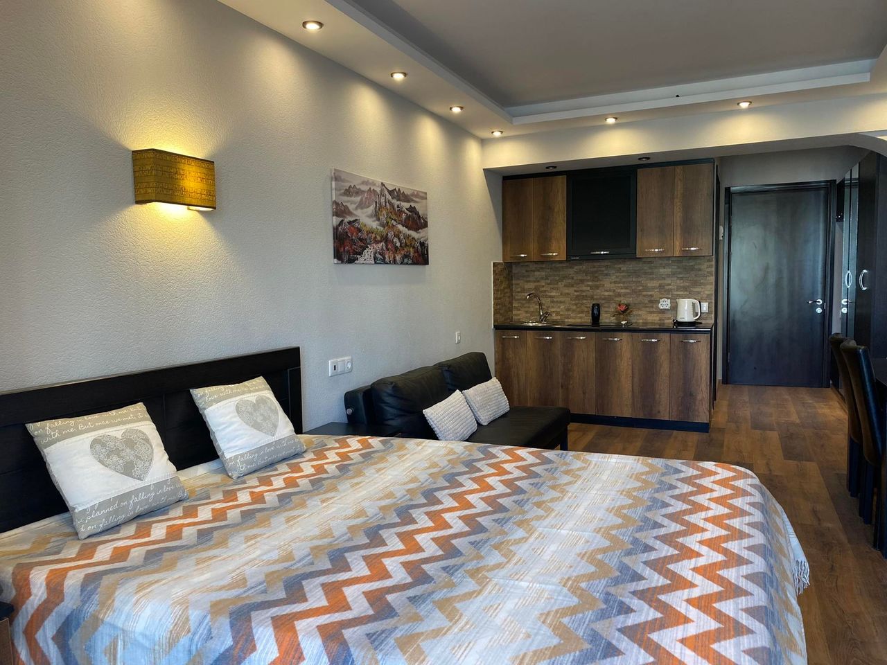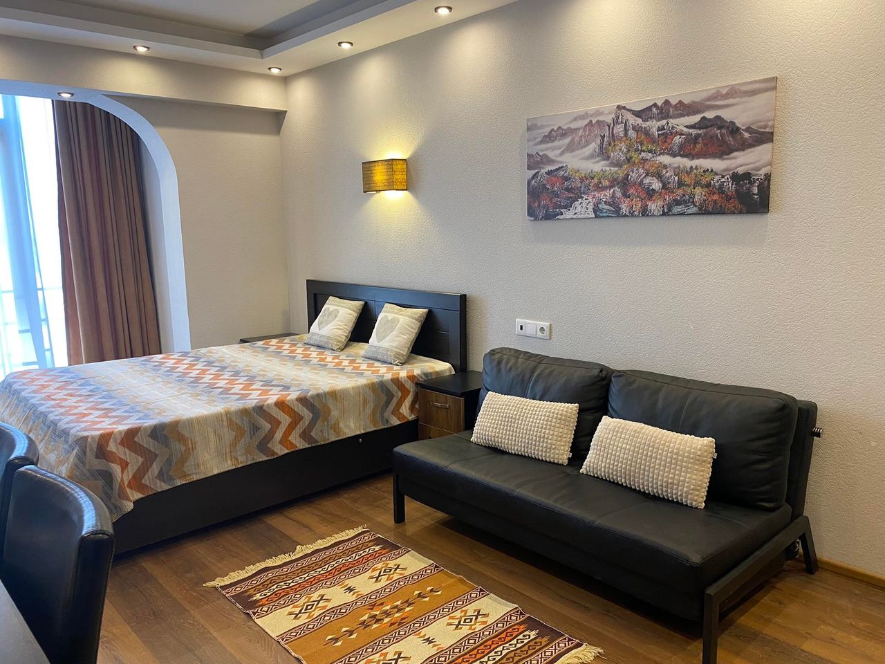 Оснащение: 1 комнатная, комфортабельная, полностью мебeлированная квартира (площадь 30 кв.м), с французским окном, с которого открывается прекрасный вид на горы. Квартира рассчитана на 4 человека, двухспальная кровать (160х200) и раскладной диван. Ванная комната в апартаментах оборудована душ-кабиной, имеется фен. LCD телевизор, полностью оборудованная кухня (посуда, эл.чайник, холодильник, плита, микроволновая печь), интернет - Wi-Fi. Постельные принадлежности и полотенца включены в стоимость.