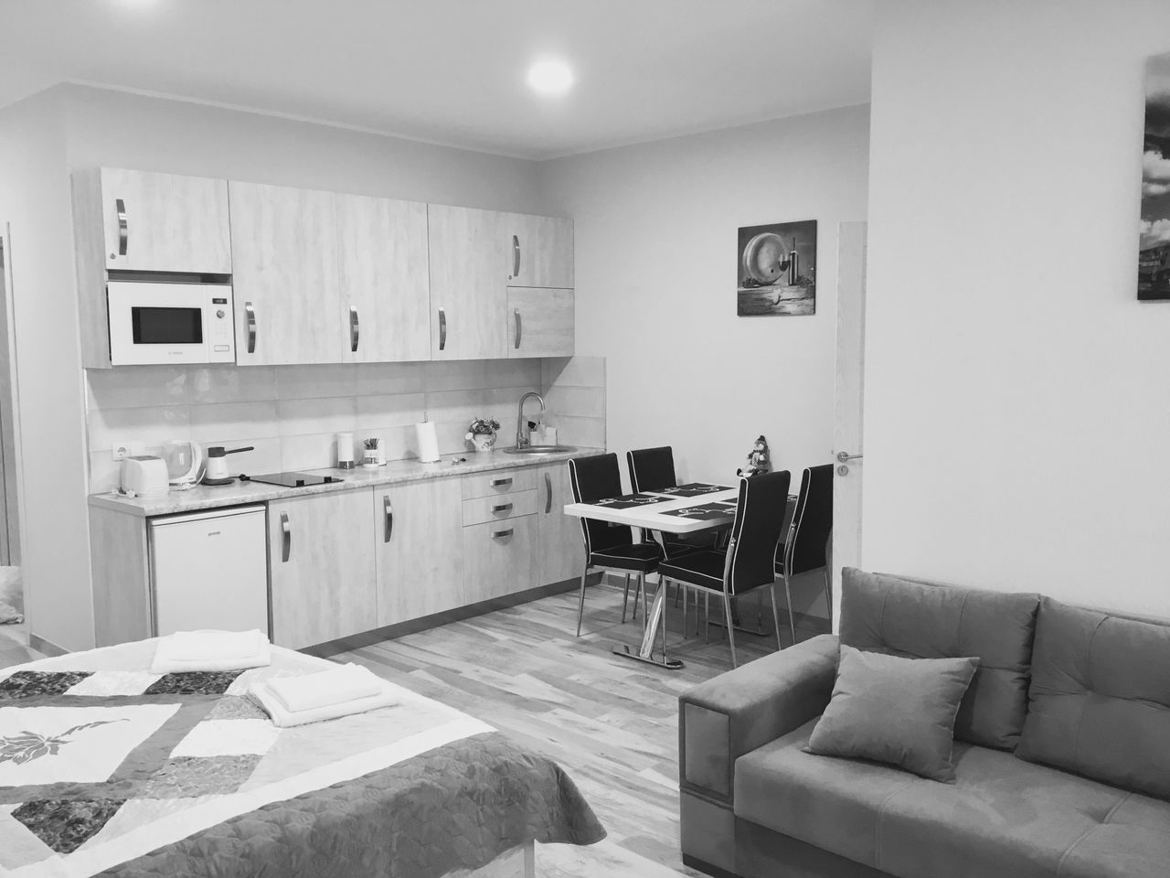 Оснащение: Апартамент студио : кухня - обеденная зона. Есть електро плита,електро чайник, електро мини кофеварка,тостер, микроволновка. В зоне отдыха есть раскладной диван, кресло, журнальный столик. Телевизор с плоским экраном. Двухместная кровать(1х70-2х20). Во второй комнате находится также двухместная кровать(1х70-2х20).ванная комната:: стиральная машына,фен.ски депоо ( хранение лыж)В данный момент к сожелению нет телевидения.