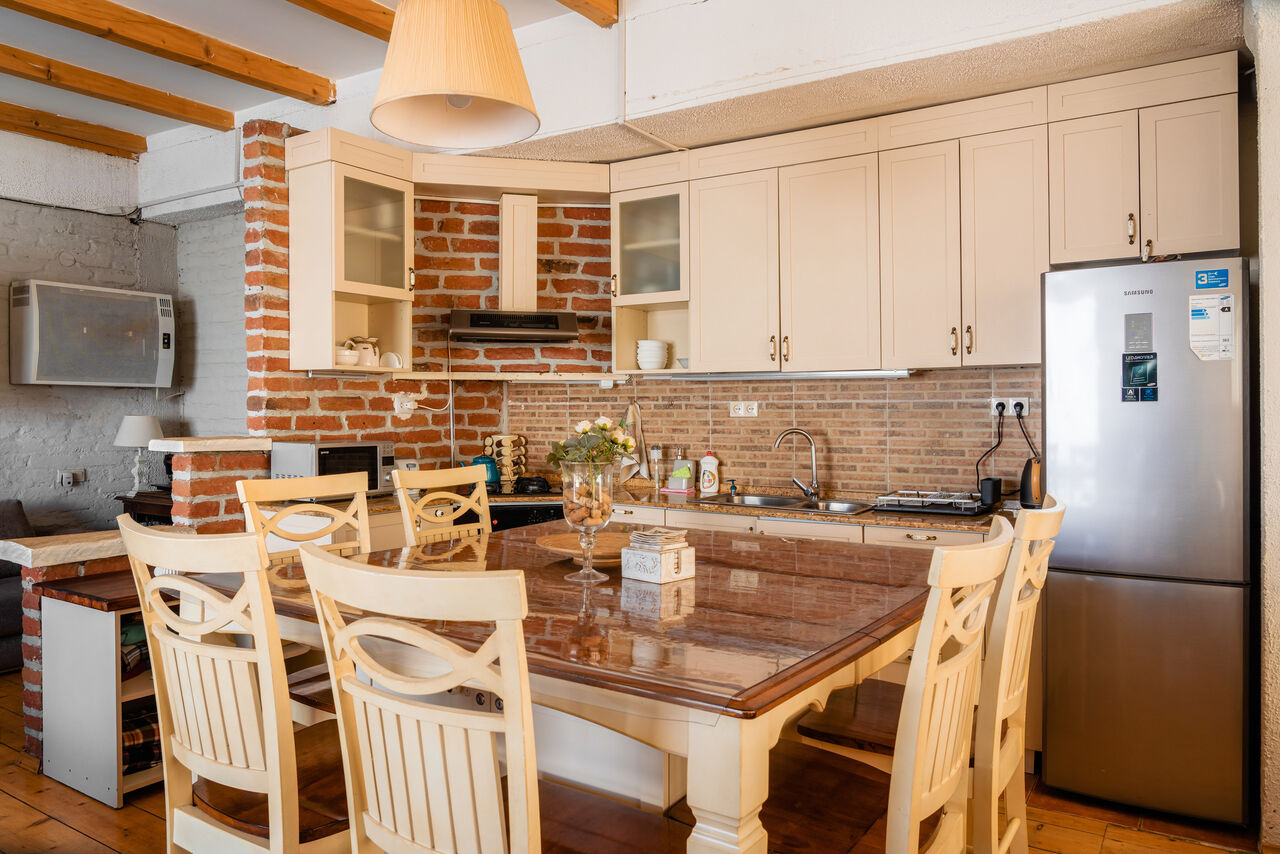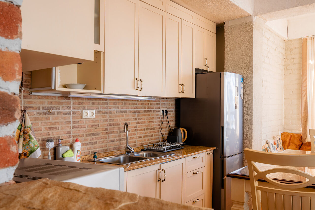 Услуги: Большой холл с кухней. Кухня укомплектована всеми необходимыми кухонными приборами (холодильник, газовая плита, духовка, микроволновка, вытяжка, посуда).