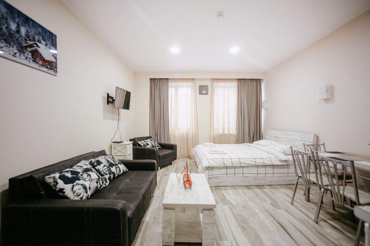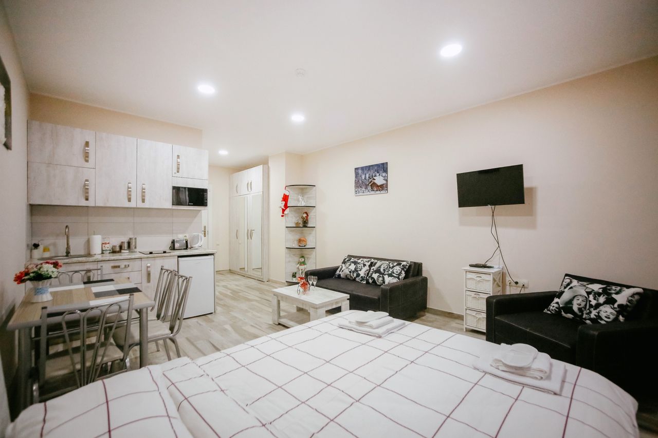 Оснащение: В студио размещена 2 местная кровать(1.70х2.20), 2 местная раскладной диван , кресло раскладное, телевизор с плоским экраном, Wi-Fi. обеденная зона. Кухня: микроволновкa,електро чайник,електро мини кофеварка,тостер, електро плита, холодильник. Стильная ванная комната спроектирована с большой душевой кабинойванной, ваннои комнате есть стиральная машина.фен. ( хранение лыж).
