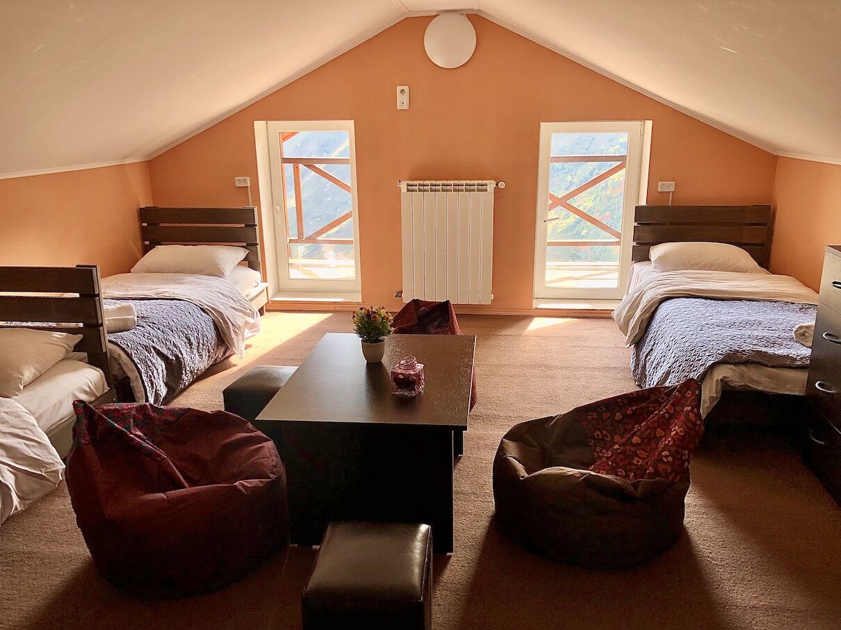 Сдается 2х комнатный номер со своим сан узлом и балконом в долгосрочную аренду (на весь зимний сезон) на горнолыжном курорте Гудаури в отеле Веранда. В номере размещается максимум 7 человек (2 чел в одной комнате , 5 чел во второй комнате). В отеле есть общая большая кухня где вы можете самостоятельно готовить и общая зона где можно проводить вечера.