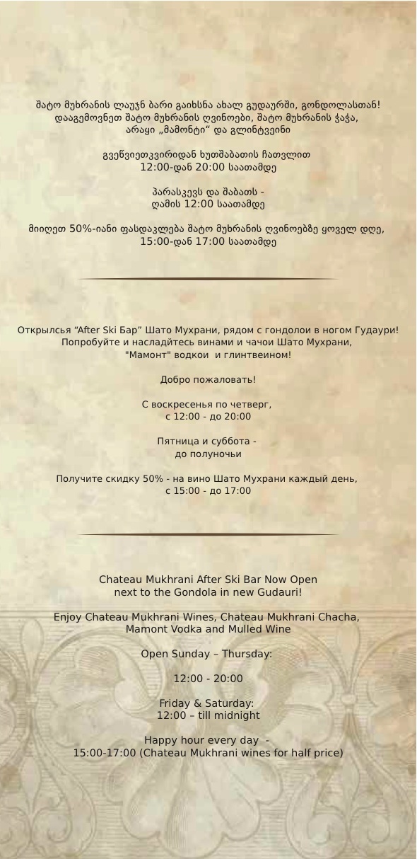 До середины марта, в связи со своим открытием, Chateau Mukhrani After Ski Bar Gudauri приглашает всех гостей Гудаури после катания зайти в Chateau Mukhrani After Ski Bar (находится у гондолы) угоститься бесплатным приветственным дринком. Гостей ждем со вторника по воскресенье с 15:00 - 18:00 или 19:00- 20:00 Дринк наливают по предъявлении флаера. Флаер можно распечатать или показать с телефона. Флаер также дает скидку 50% на вино Шато Мухрани с 15.00-17.00. Ссылка на флаер тут. Бар работает до последнего посетителя. контакт по всем вопросам Rene Schulthoff +995 599 130 558 |