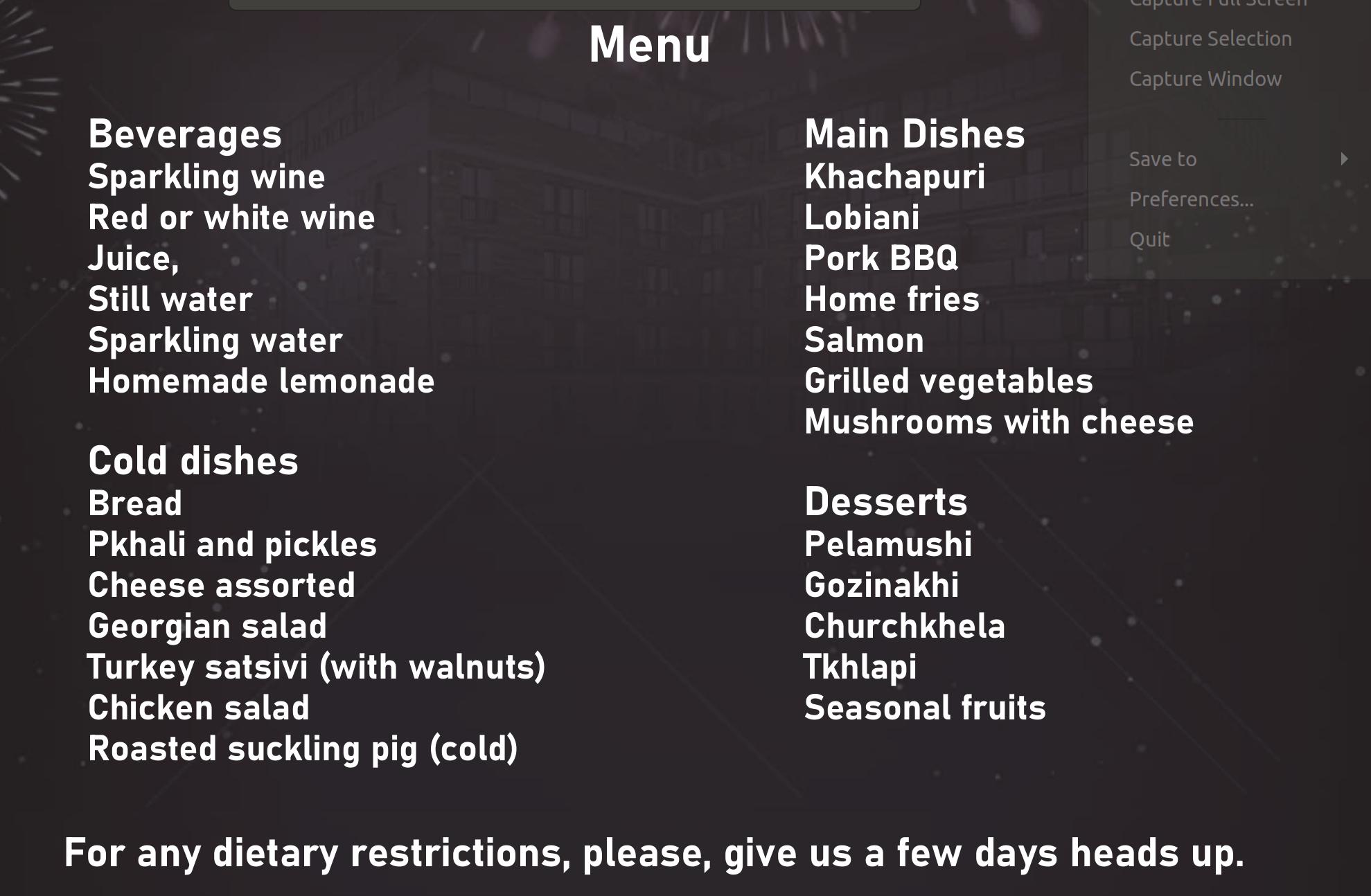 Стоимость Новогоднего стола составляет -100$ c человека.