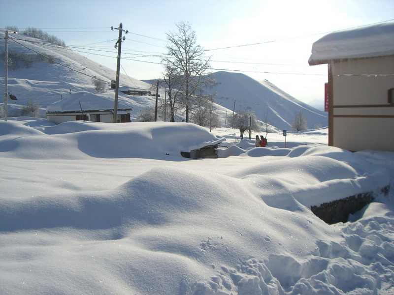 Вот ночной снегопад по –дружески и подарил нам праздник , настроение , смех и солнце . Первый день весны расстелил невесомое пушистое белоснежное одеяло от вершин Кудеби и Садзеле до самого порога . Оставалось пойти и взять свою долю радости .