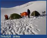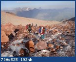 Отдохнув до обеда, собрали лагерь и вышли «наверх». Большинство народу в это время года ходят на вершину из лагеря в лагерь (12-15часов). Думаю, в этом случае важно знание маршрута или наличие проводника – хотя туры и встречаются, и в основном, есть тропа – выбирать путь нужно внимательно. У нас не было проводника и и в этих горах мы впервые, поэтому решили разбить следующий лагерь выше. Мы прошли по морене, в верхней части сильно пробиваемой камнями, которые, слава богу, не долетали к нам.