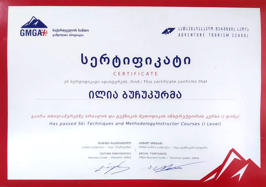 Инструктор прослушал курс первого уровня. Сертификат выдан http://alpinesports.ge/
